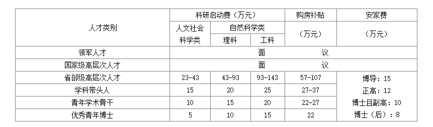 ?。?)學(xué)校為全職在我校工作的引進(jìn)人才提供博士學(xué)位津貼、安家費(fèi)、購(gòu)房補(bǔ)貼和科研啟動(dòng)費(fèi)等,安家費(fèi)、購(gòu)房補(bǔ)貼(分5年支付)和科研啟動(dòng)費(fèi)標(biāo)準(zhǔn)見《全職引進(jìn)人才享受優(yōu)惠待遇參照表》,博士學(xué)位津貼按每月1000元發(fā)放。