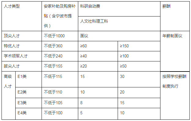 ?。ǘ┨峁╅L三角地區(qū)具有行業(yè)競爭力的薪酬待遇;根據(jù)個人情況可獲得寧波市安家費、購房補貼和學校提供的購房補貼、科研啟動費等,總額不低于100萬元,詳見《高層次人才引進待遇表》;對于緊缺學科或特別情況的,待遇可面議。待遇均為稅前,扣稅政策按寧波市有關(guān)規(guī)定執(zhí)行。