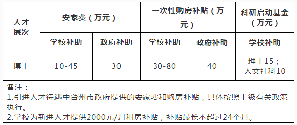 聘用人員除按國(guó)家有關(guān)規(guī)定享受工資、保險(xiǎn)等待遇外,符合《臺(tái)州開放大學(xué)人才引進(jìn)辦法》高層次人才標(biāo)準(zhǔn)的提供購(gòu)房補(bǔ)貼、安家費(fèi)、科研啟動(dòng)費(fèi)等方面的待遇。詳見下表: