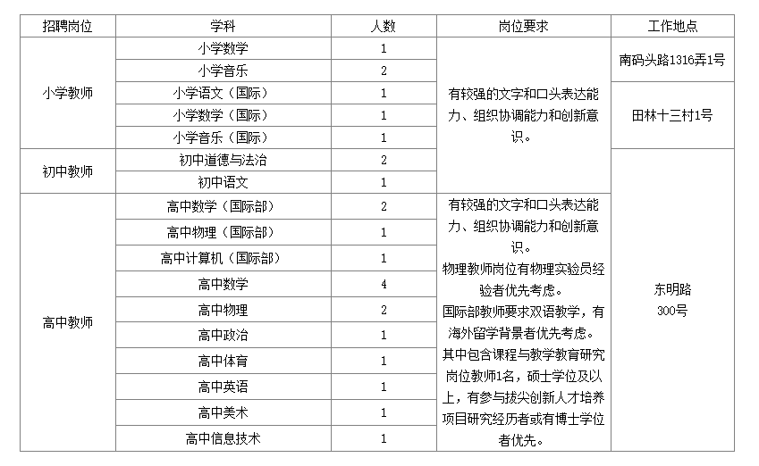 根據(jù)《上海市事業(yè)單位公開(kāi)招聘人員辦法》(滬人社規(guī)〔2019〕15號(hào)),結(jié)合學(xué)校發(fā)展需要,按照公開(kāi)、平等、競(jìng)爭(zhēng)、擇優(yōu)的原則,面向社會(huì)公開(kāi)招聘中小學(xué)教師。