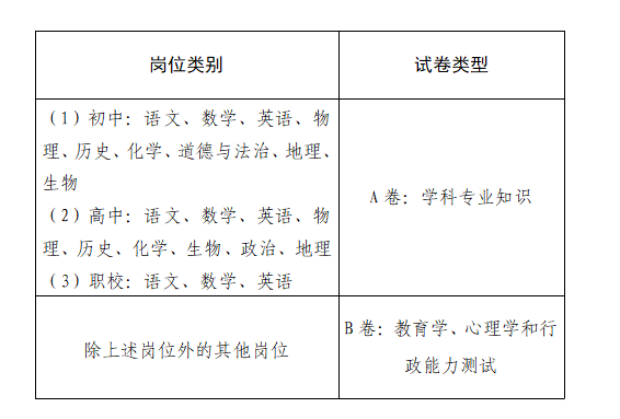 筆試按測(cè)試內(nèi)容分為A、B兩種試卷類型。A卷測(cè)試內(nèi)容為學(xué)科專業(yè)知識(shí),B卷測(cè)試內(nèi)容為教育學(xué)、心理學(xué)和行政能力測(cè)試。具體崗位測(cè)試內(nèi)容見(jiàn)下表: