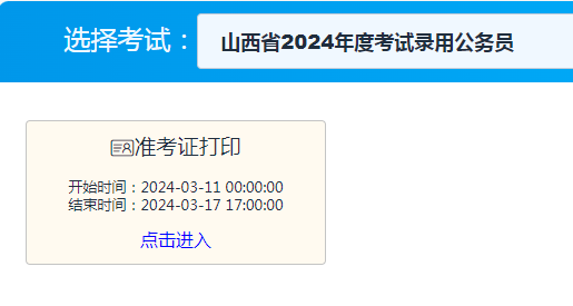 點(diǎn)擊進(jìn)入:2024年山西公務(wù)員考試準(zhǔn)考證打印入口(3月11日至17日)