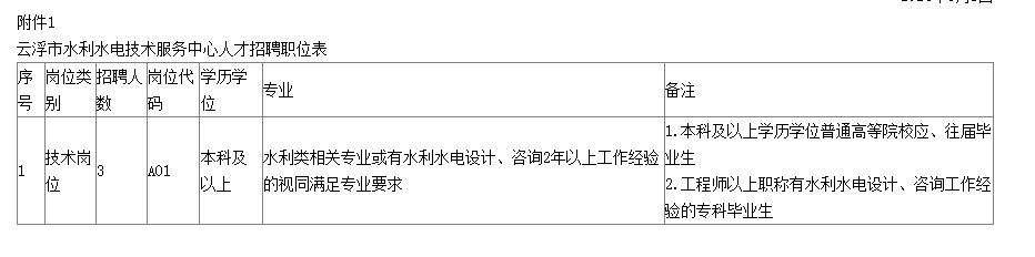 附件1:云浮市水利水電技術服務中心人才招聘職位表