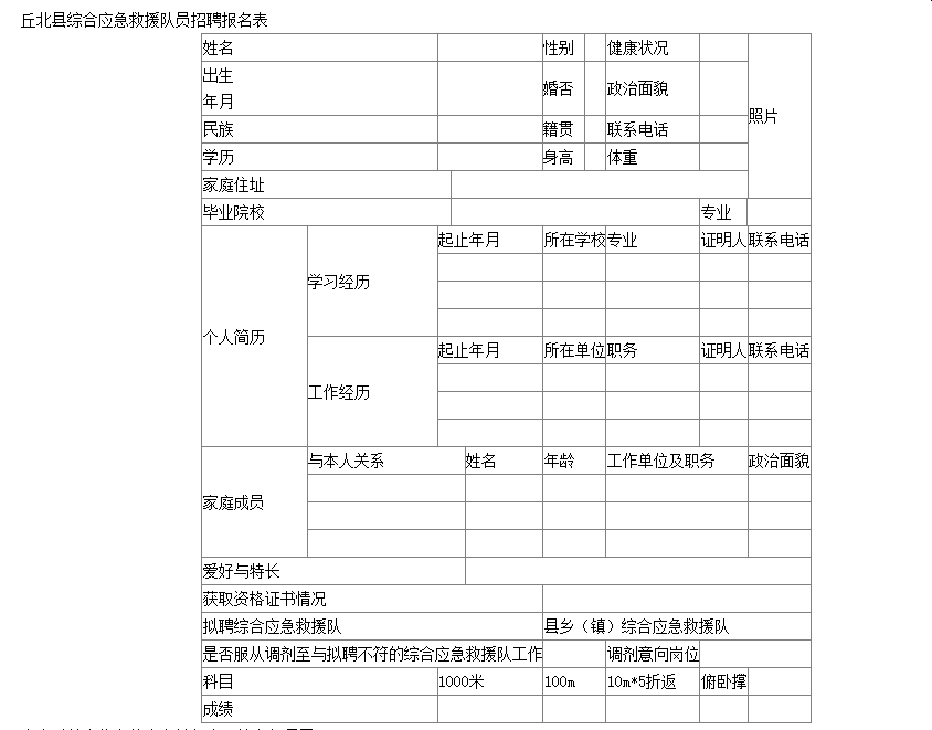 (二)報(bào)名申請:接受報(bào)名者本人到報(bào)名地點(diǎn)進(jìn)行報(bào)名(不接受委托報(bào)名)或通過QQ郵箱報(bào)名,競聘者自行打印或填寫《丘北縣政府專職消防員報(bào)名表》(附件一),填寫完畢后攜(傳)報(bào)名資料在報(bào)名時(shí)間內(nèi)交至丘北縣消防救援大隊(duì)文秀路消防救援站二樓辦公室。(丘北縣文秀路67號)。