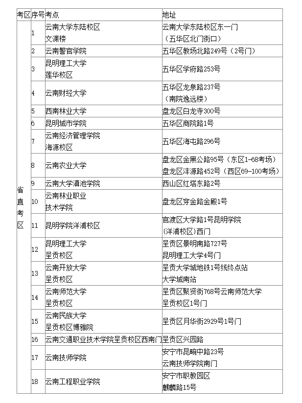 省直考區(qū)安排在昆明市,共設(shè)18個(gè)考點(diǎn),考生可根據(jù)準(zhǔn)考證信息確認(rèn)自己的考點(diǎn),避免找錯(cuò)考點(diǎn)、進(jìn)錯(cuò)考場??键c(diǎn)具體地址如下: