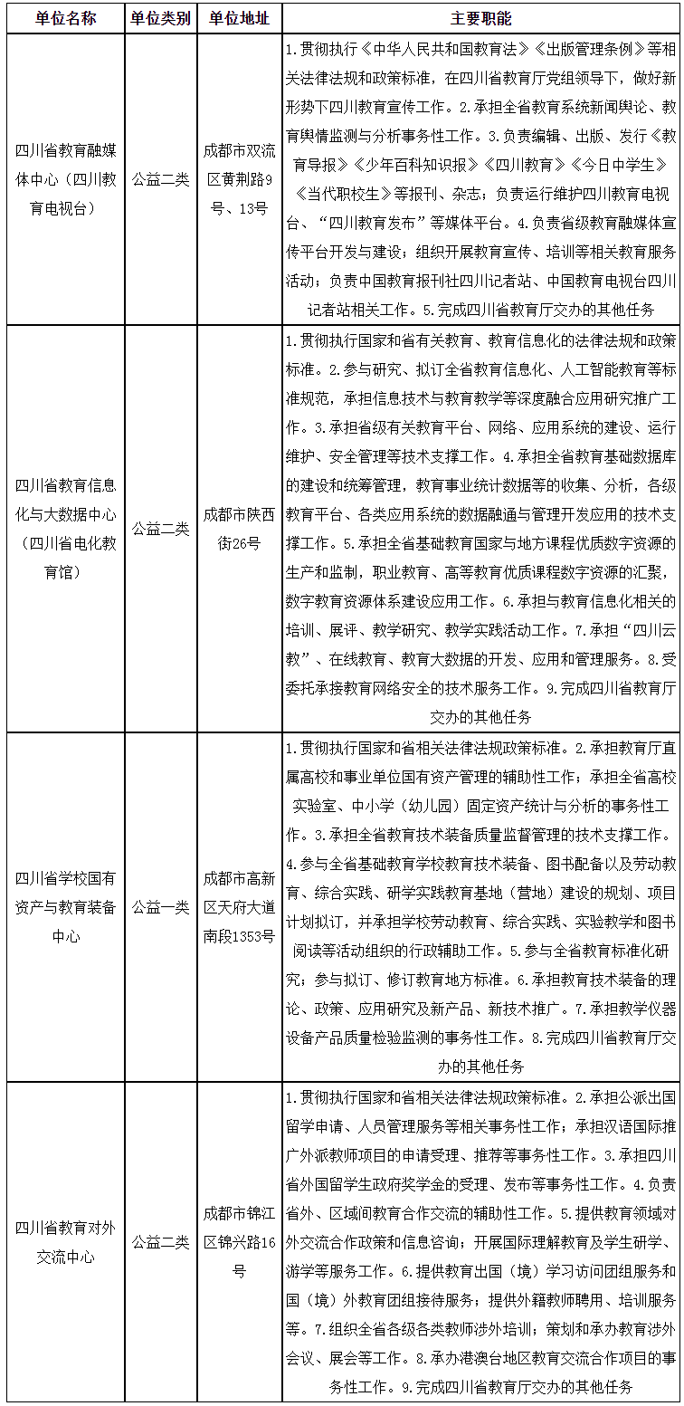 根據(jù)《事業(yè)單位人事管理?xiàng)l例》、《事業(yè)單位公開招聘人員暫行規(guī)定》和《四川省省屬事業(yè)單位公開招聘工作人員實(shí)施細(xì)則(試行)》等有關(guān)規(guī)定,四川省教育廳擬面向社會(huì)公開招聘部分工作人員補(bǔ)充到四川省教育融媒體中心(四川教育電視臺(tái))、四川省教育信息化與大數(shù)據(jù)中心(四川省電化教育館)、四川省學(xué)校國(guó)有資產(chǎn)與教育裝備中心、四川省教育對(duì)外交流中心等4個(gè)直屬事業(yè)單位工作?,F(xiàn)將公開招聘有關(guān)事項(xiàng)公告如下(本公告由教育廳同時(shí)在四川省人力資源和社會(huì)保障廳官網(wǎng)[rst.sc.gov.cn,下同]“人事考試”專欄和教育廳官網(wǎng)[http://edu.sc.gov.cn/,下同]上發(fā)布。