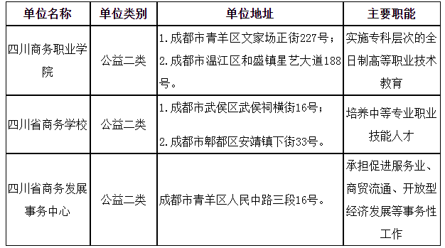 根據(jù)《事業(yè)單位人事管理?xiàng)l例》《事業(yè)單位公開招聘人員暫行規(guī)定》和《四川省省屬事業(yè)單位公開招聘工作人員實(shí)施細(xì)則(試行)》等有關(guān)規(guī)定,四川省商務(wù)廳擬面向社會(huì)公開招聘部分工作人員補(bǔ)充到四川商務(wù)職業(yè)學(xué)院、四川省商務(wù)學(xué)校、四川省商務(wù)發(fā)展事務(wù)中心等3個(gè)下屬事業(yè)單位工作。現(xiàn)將公開招聘有關(guān)事項(xiàng)公告如下(本公告由四川省商務(wù)廳同時(shí)在四川省人力資源和社會(huì)保障廳官網(wǎng)[rst.sc.gov.cn,下同]“人事考試”專欄和四川省商務(wù)廳官網(wǎng)[swt.sc.gov.cn,下同]上發(fā)布。)