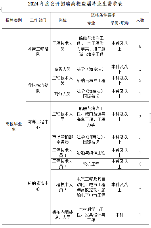 ?。ㄎ澹?yīng)聘高校畢業(yè)生接收計(jì)劃的應(yīng)為2024年應(yīng)屆畢業(yè)生,并如期取得畢業(yè)證書(shū)。其中,應(yīng)聘陸地管理崗位的(含救撈工程船隊(duì)商務(wù)人員、海洋工程中心市場(chǎng)營(yíng)銷部商務(wù)員、船舶修造中心船舶內(nèi)舾裝設(shè)計(jì)人員、財(cái)務(wù)核算、人事管理崗),應(yīng)取得2024年度國(guó)家公務(wù)員考試筆試合格成績(jī)。