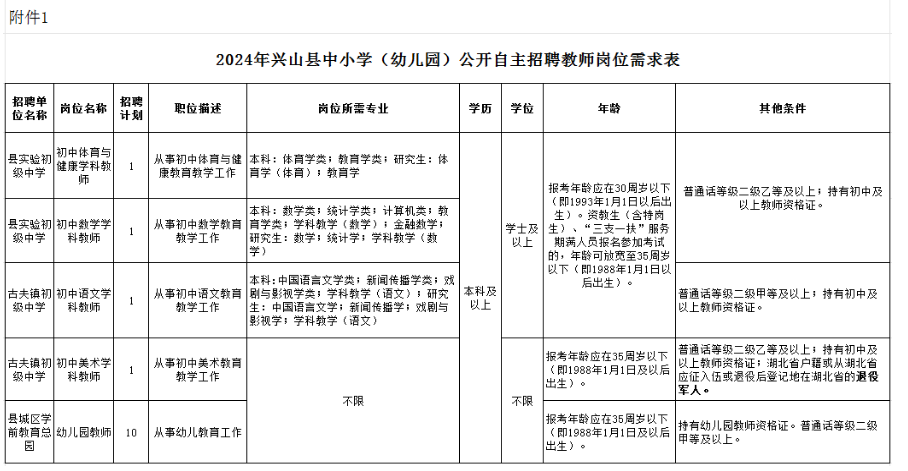 2.報(bào)考自主招聘中小學(xué)(幼兒園)教師崗位條件以《2024年興山縣中小學(xué)(幼兒園)公開自主招聘教師崗位需求表》(附件1)為準(zhǔn)。