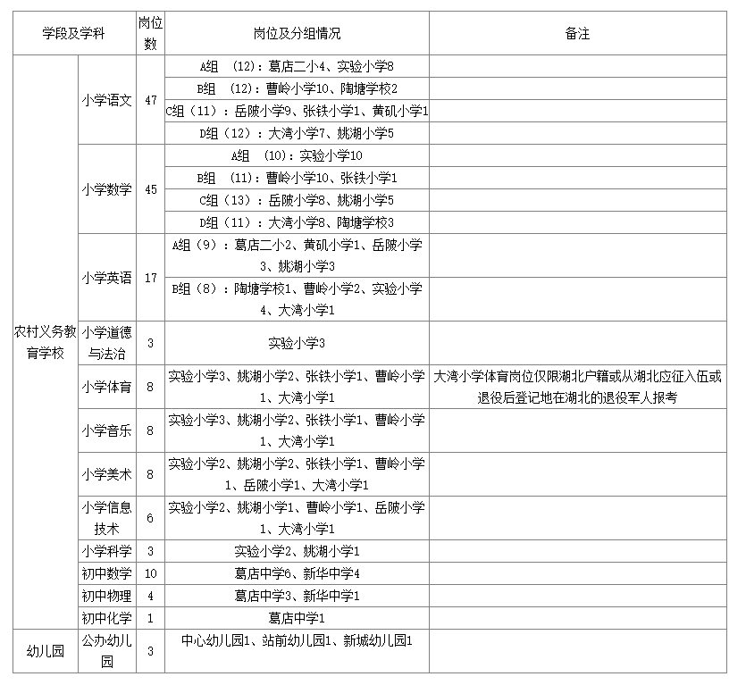 ?。?)崗位設(shè)置:葛店經(jīng)開區(qū)大灣小學(xué)體育崗位(1個);