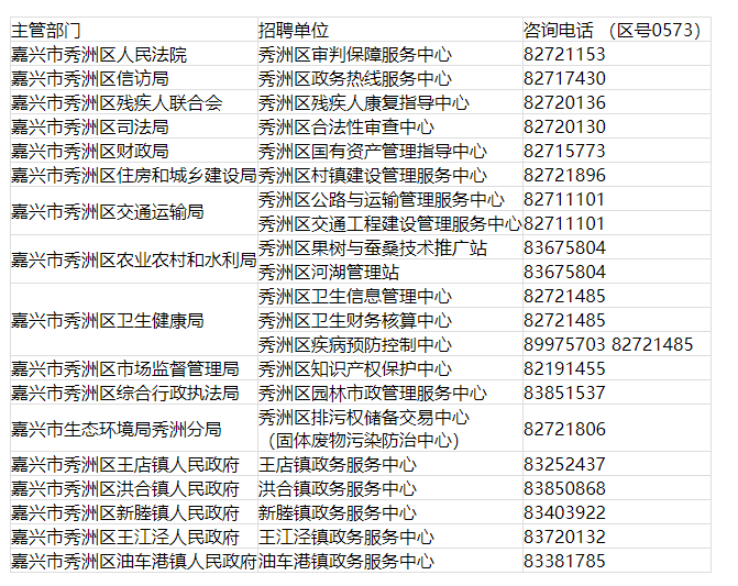 (九)本次公開(kāi)招聘是秀洲區(qū)人力社保局受區(qū)級(jí)機(jī)關(guān)部門(mén)(單位)委托集中組織。對(duì)事業(yè)單位信息、報(bào)考崗位、學(xué)歷學(xué)位、所需專業(yè)要求以及其他要求等需要咨詢時(shí),請(qǐng)應(yīng)聘人員直接與招聘單位聯(lián)系,招聘單位的咨詢電話已在招聘公告和《計(jì)劃及崗位要求表》上列出。