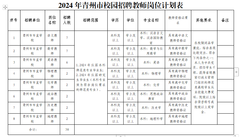 招聘事業(yè)編制教師30名,具體崗位及條件詳見附件1。