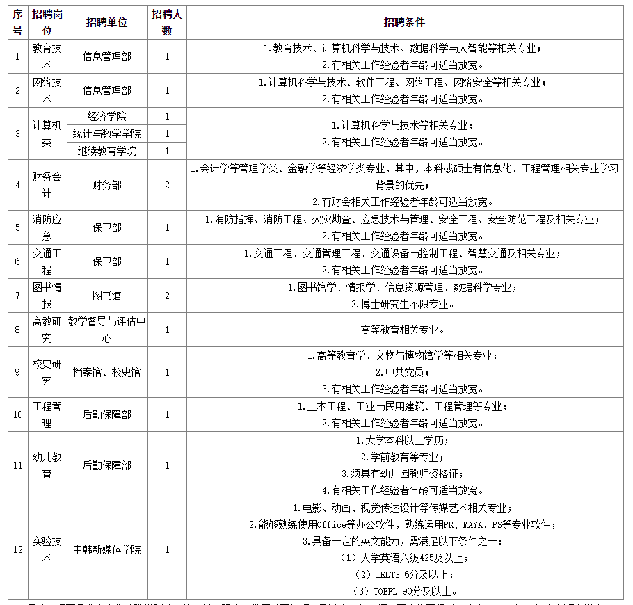 備注:招聘條件中未作特殊說明的,均應(yīng)具有研究生學(xué)歷并獲得碩士及以上學(xué)位。博士研究生不超過32周歲(1992年6月30日以后出生),碩士研究生不超過28周歲(1996年6月30日以后出生),本科生不超過25周歲(1999年6月30日以后出生)。某些崗位需要有相關(guān)工作經(jīng)驗(yàn)者,本科生年齡可放寬至27周歲(1997年6月30日以后出生),碩士研究生年齡可放寬至30周歲(1994年6月30日以后出生),博士研究生可放寬至35周歲(1989年6月30日以后出生)。