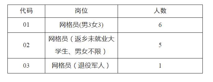 本次共招聘專職網(wǎng)格員12名,具體崗位如下:
