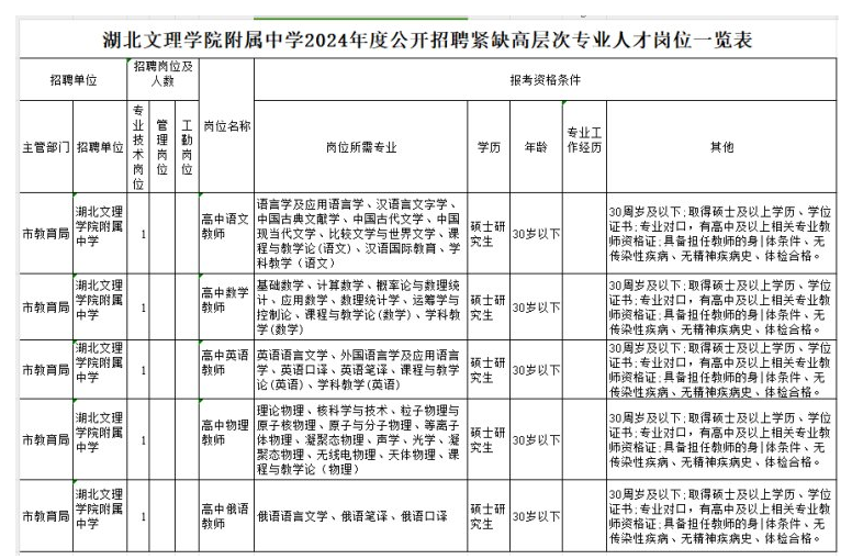 ?。ㄒ唬┖蔽睦韺W(xué)院附屬中學(xué)擬公開招聘緊缺高層次專業(yè)人才5名。崗位條件詳情見《湖北文理學(xué)院附屬中學(xué)2024年度公開招聘緊缺高層次專業(yè)人才崗位一覽表》。