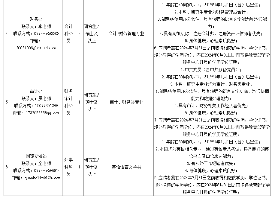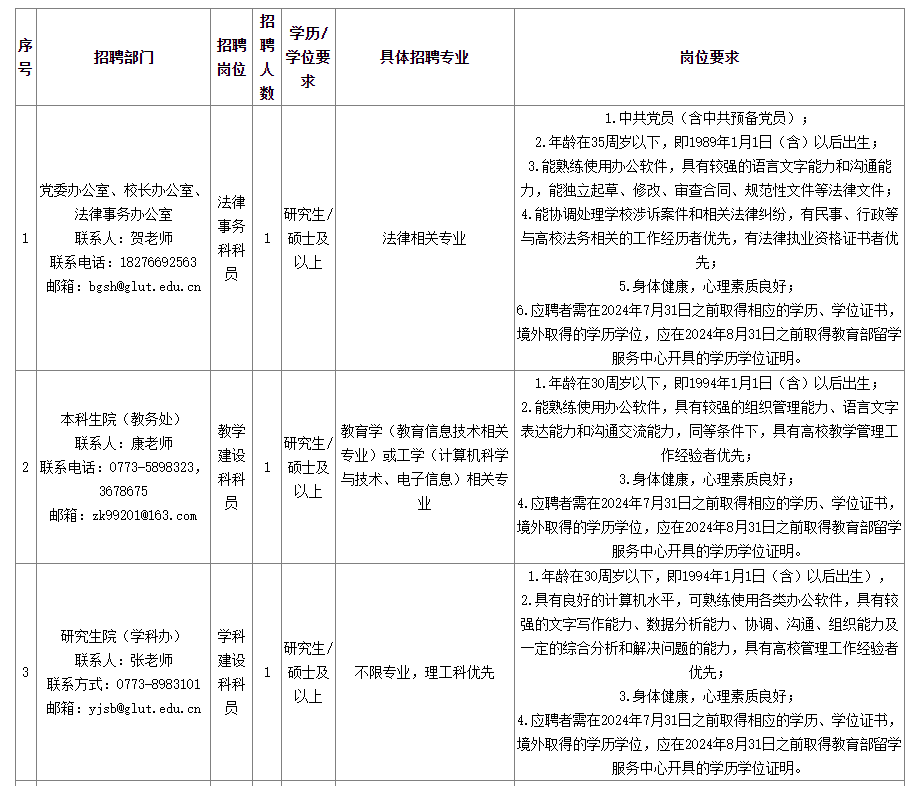 具體招聘事宜請聯(lián)系各招聘部門負責人;其他未盡事宜請聯(lián)系人事處咨詢,聯(lián)系人:丑老師或周老師,聯(lián)系電話:0773-2670319。