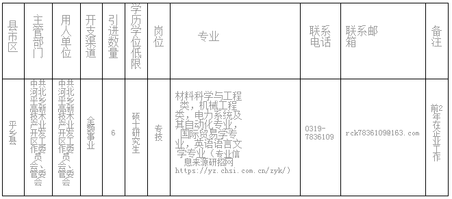 為進(jìn)一步增強(qiáng)我縣高新技術(shù)產(chǎn)業(yè)開發(fā)區(qū)科研實(shí)力和核心競(jìng)爭(zhēng)力,經(jīng)研究決定,面向社會(huì)為河北平鄉(xiāng)高新技術(shù)產(chǎn)業(yè)開發(fā)區(qū)公開引進(jìn)6名符合發(fā)展需要的高學(xué)歷、高層次人才。現(xiàn)將有關(guān)事項(xiàng)公告如下: