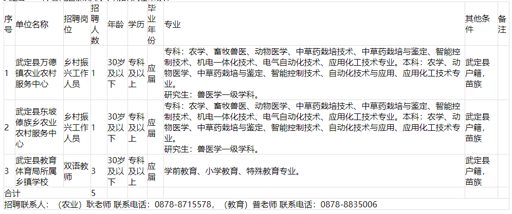 武定縣東坡傣族鄉(xiāng)農(nóng)業(yè)農(nóng)村服務(wù)中心工作人員1名;武定縣萬(wàn)德鎮(zhèn)農(nóng)業(yè)農(nóng)村服務(wù)中心工作人員1名;武定縣教育體育局所屬鄉(xiāng)鎮(zhèn)學(xué)校教師3名。詳見(jiàn)《武定縣2024年民族地區(qū)緊缺人才專(zhuān)項(xiàng)招聘崗位計(jì)劃表》(附件1)。