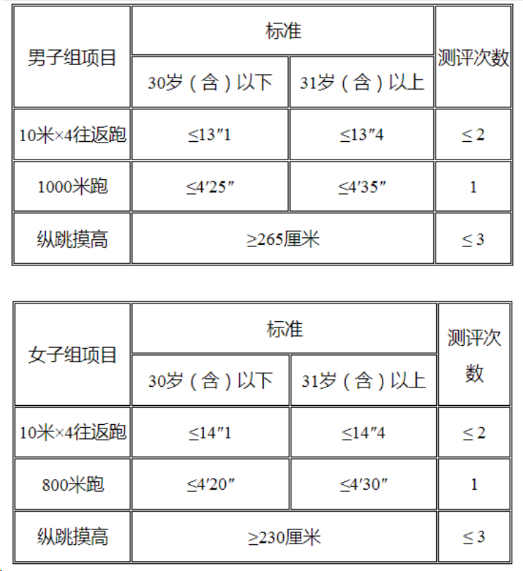2、結(jié)果判定??忌枰淮涡酝ㄟ^三項(xiàng)測評方為體能測評合格,其中:10米×4往返跑測評不超過2次、縱跳摸高測評不超過3次、長跑測評1次;凡其中一項(xiàng)在規(guī)定測評次數(shù)內(nèi)未達(dá)標(biāo)的,不再進(jìn)行后續(xù)項(xiàng)目測評,體能測評結(jié)果為不合格。