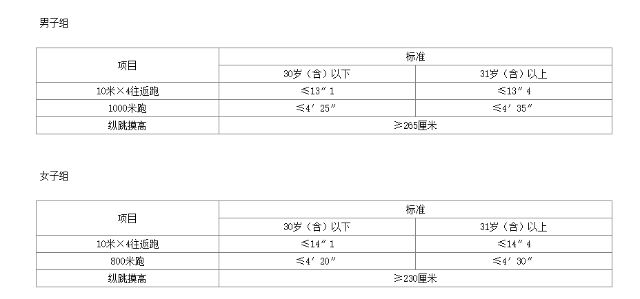 體能測(cè)評(píng)項(xiàng)目中,縱跳摸高項(xiàng)目的測(cè)評(píng)次數(shù)不超過(guò)3次,10米×4往返跑項(xiàng)目測(cè)評(píng)次數(shù)不超過(guò)2次,1000米(男)/800米(女)跑項(xiàng)目測(cè)評(píng)次數(shù)為1次。報(bào)考緊缺職位的考生,體能測(cè)評(píng)三項(xiàng)中有兩項(xiàng)達(dá)標(biāo)的,視為合格;其他職位體能測(cè)評(píng)項(xiàng)目三項(xiàng)全部達(dá)標(biāo)的方為合格。