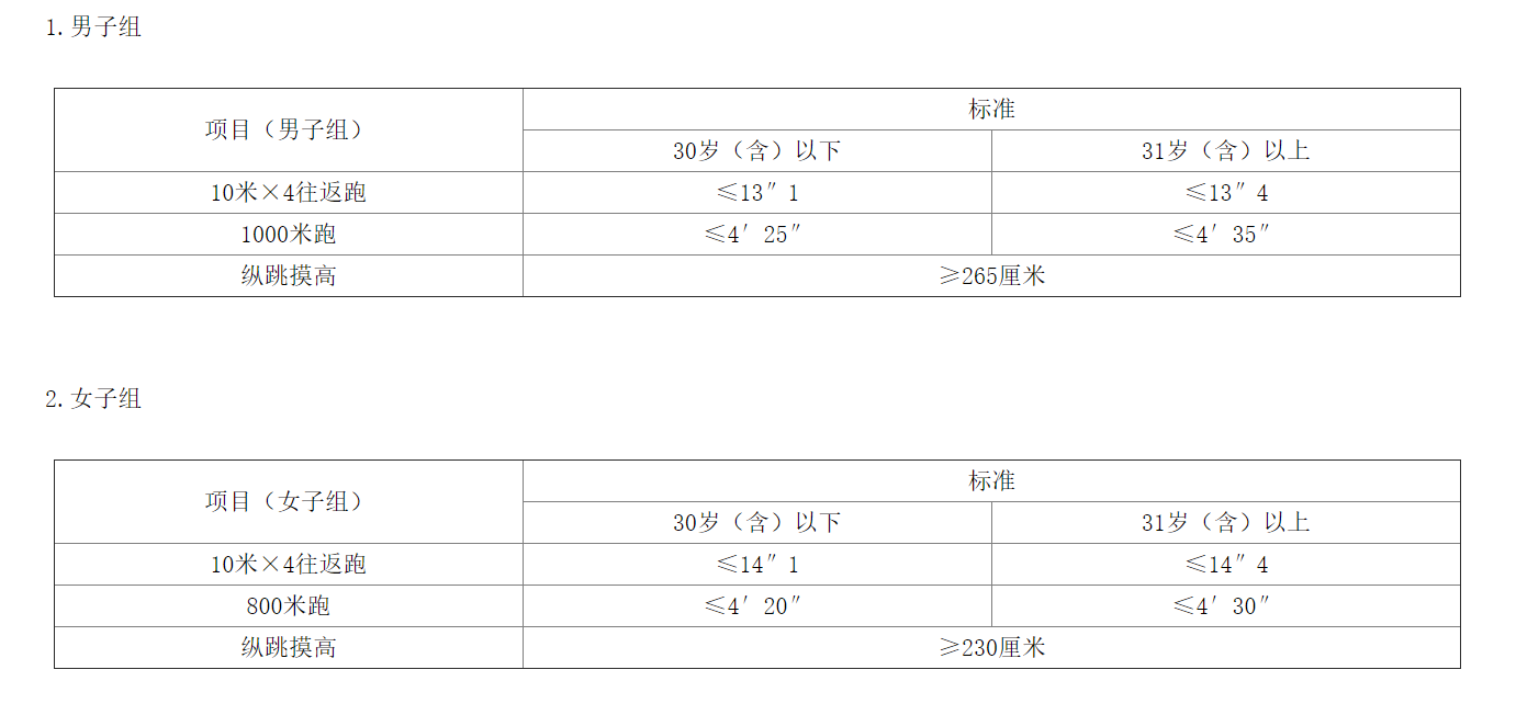 特戰(zhàn)職位體能測評三項均達標(biāo)方為合格,網(wǎng)絡(luò)安全、大數(shù)據(jù)、法醫(yī)、小語種、公安法制職位三項中有兩項達標(biāo)的,視為合格。年齡計算時間截止到參加體能測評當(dāng)月。體能測評結(jié)果當(dāng)場公布。
