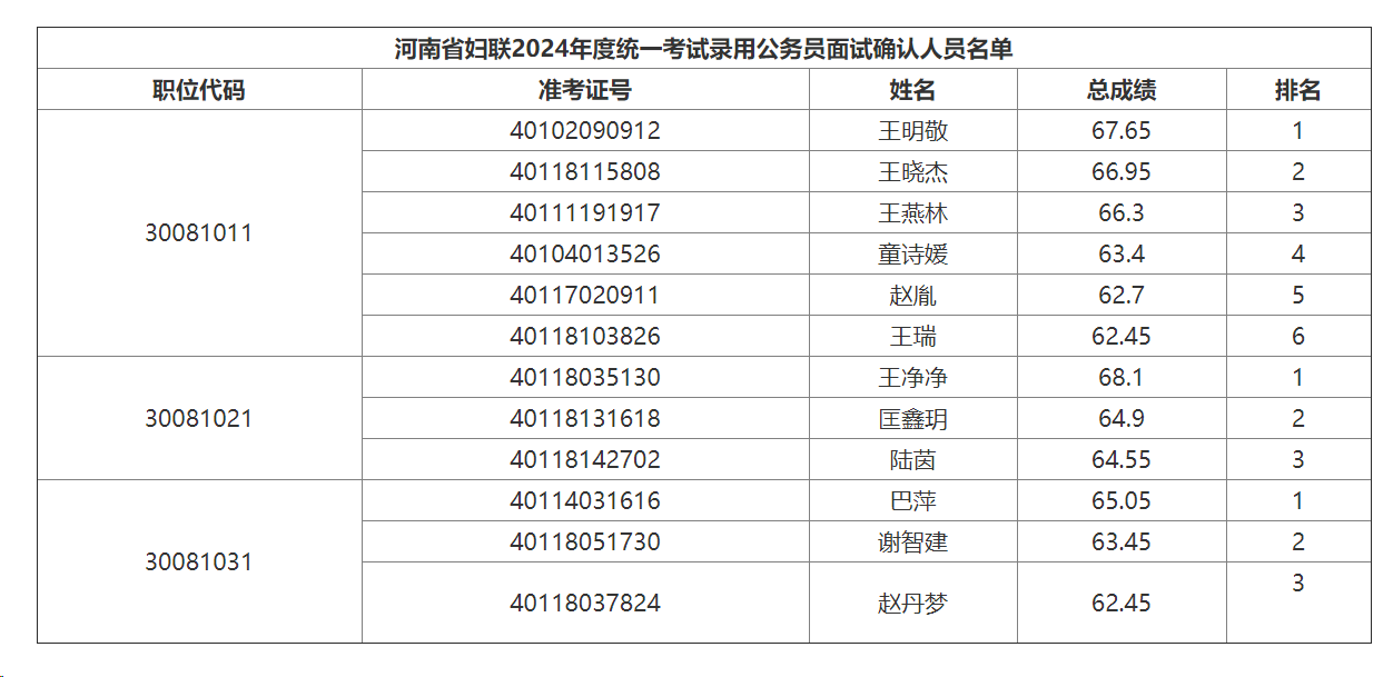 1.河南省婦聯(lián)2024年度統(tǒng)一考試錄用公務(wù)員面試確認(rèn)人員名單