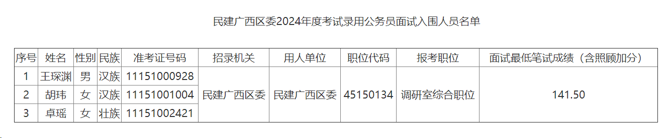 根據(jù)自治區(qū)公務員主管部門劃定的2024年度考試錄用公務員公共科目筆試合格分數(shù)線和規(guī)定比例,按照筆試總成績(筆試總成績=行政職業(yè)能力測驗+申論成績+少數(shù)民族照顧加分)從高分到低分的順序,并經(jīng)資格審查確定王琛淵等3名考生進入面試(名單詳見附1)。