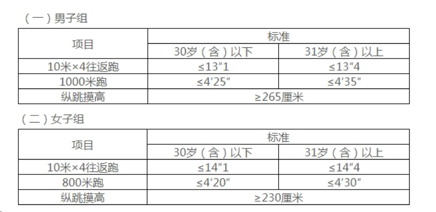 體能測評三項(xiàng)全部達(dá)標(biāo)方為合格。報(bào)考緊缺職位的人員,體能測評項(xiàng)目3項(xiàng)中有2項(xiàng)達(dá)標(biāo)的,視為合格。體能測評項(xiàng)目中,縱跳摸高的測試次數(shù)不超過3次(當(dāng)場),10米×4往返跑的測試次數(shù)不超過2次(當(dāng)場),男子1000米跑和女子800米跑項(xiàng)目的測試次數(shù)均為1次。年齡計(jì)算時(shí)間截止到參加體能測評當(dāng)月。