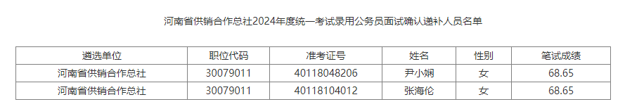 河南省供銷合作總社2024年統(tǒng)一考試錄用公務員面試確認遞補公告