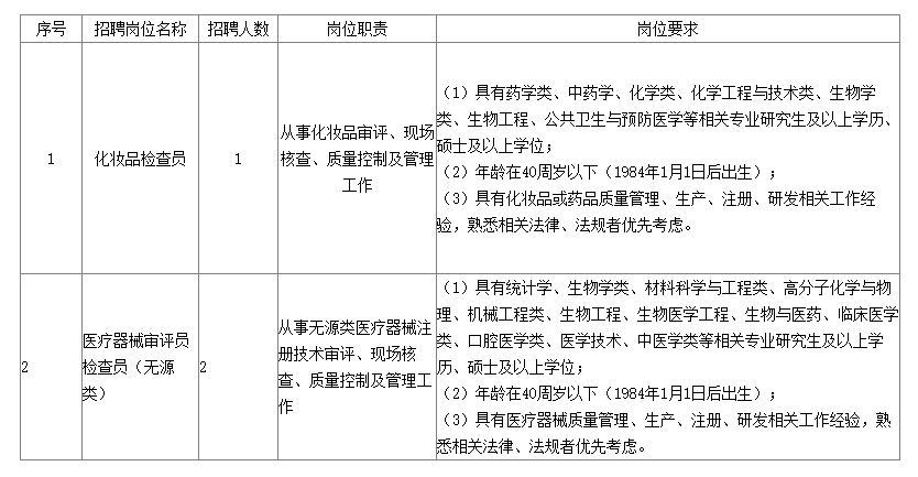 為進一步深化干部人事制度改革,拓寬選人用人視野,根據(jù)《上海市事業(yè)單位公開招聘人員辦法》(滬人社規(guī)〔2019〕15號),按照公開、平等、競爭、擇優(yōu)的原則,現(xiàn)面向社會公開招聘化妝品檢查員和醫(yī)療器械審評員檢查員(無源類)。