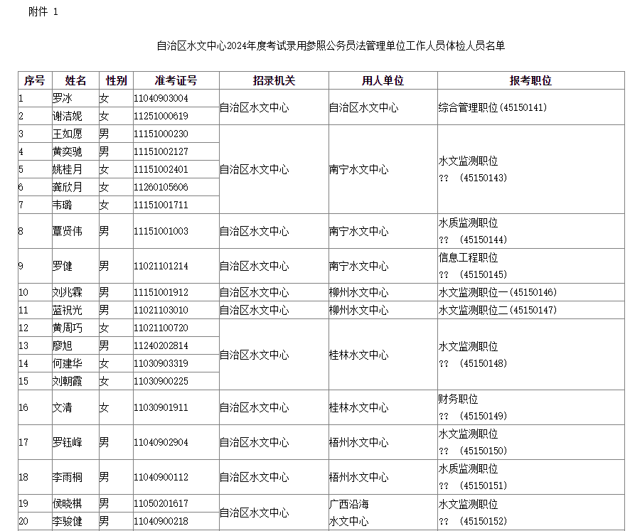 附件:1.自治區(qū)水文中心2024年度考試錄用參照公務(wù)員法管理單位工作人員體檢人員名單