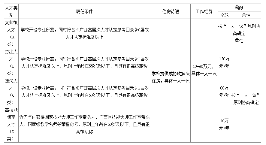 符合《廣西電力職業(yè)技術(shù)學(xué)院高層次人才(高水平團(tuán)隊(duì))引進(jìn)和管理辦法(試行)》(桂電職院〔2021〕24號)文件關(guān)于人才分類中A類-D類認(rèn)定條件,經(jīng)學(xué)校認(rèn)定,明確人才類別及考核目標(biāo)和工作任務(wù)后,符合條件的人員可以享受以下待遇: