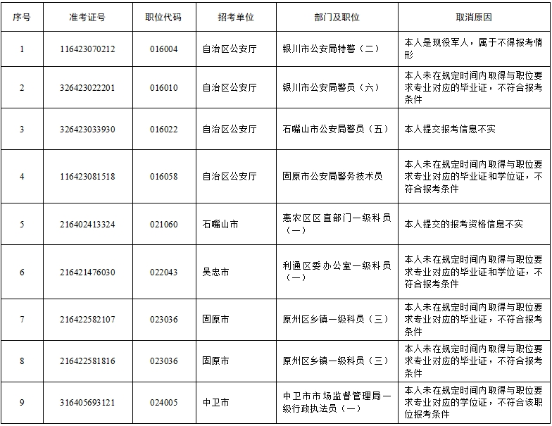 根據(jù)《寧夏回族自治區(qū)2024年考試錄用公務員公告》相關規(guī)定,自治區(qū)公務員局會同有關部門及各招錄機關對2024年全區(qū)考試錄用公務員擬進入面試的報考者進行了資格復審。復審中發(fā)現(xiàn),部分報考者不符合職位資格條件,部分報考者放棄面試資格,個別職位達不到面試開考比例。經(jīng)自治區(qū)公務員主管部門研究,決定取消部分報考者面試資格,降低部分職位面試開考比例?,F(xiàn)將有關情況公告如下: