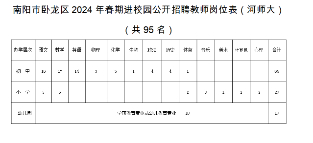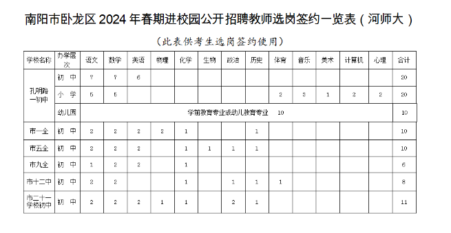 1、南陽(yáng)市臥龍區(qū)2024年春期進(jìn)校園公開(kāi)招聘教師崗位表(河師大)