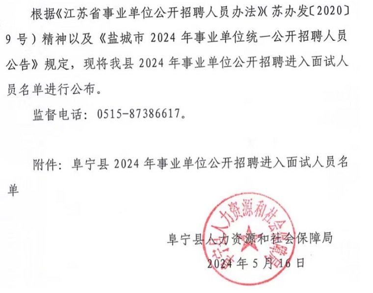2024年江蘇鹽城阜寧縣事業(yè)單位招聘進入面試人員名單