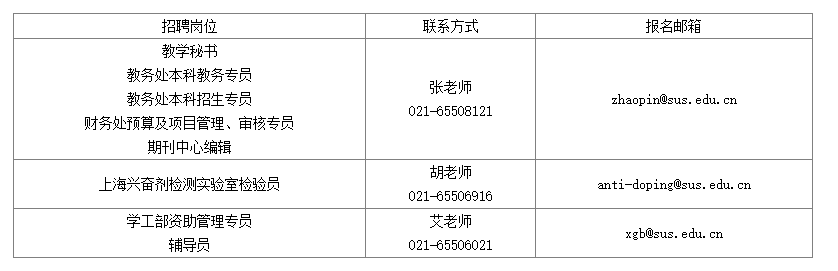 2、報(bào)名方式:應(yīng)聘者填寫《2024年上海體育大學(xué)應(yīng)聘人員信息表(姓名+崗位)》(見附件),通過電子郵件(郵件主題為:應(yīng)聘崗位+姓名)發(fā)送至報(bào)名郵箱。