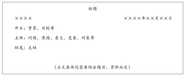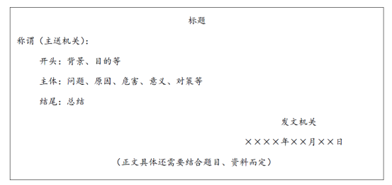 標(biāo)題要注意包含題目主題詞,居中書(shū)寫(xiě);正文部分的書(shū)寫(xiě)格式與一般公文差別不大,包含開(kāi)頭、主體、結(jié)尾三部分。