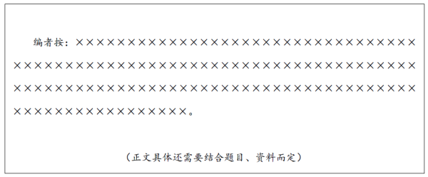 這一公文的格式不同于其他公文,一般由標(biāo)題與正文組成。其中,標(biāo)題一般左空兩格直接寫(xiě)為“編者按”,后加“:”,其后緊跟正文內(nèi)容,正文內(nèi)容的書(shū)寫(xiě)格式與一般公文區(qū)別不大。