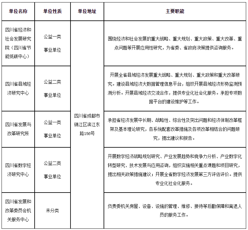 本次選調(diào)涉及我委直屬四川省經(jīng)濟(jì)和社會(huì)發(fā)展研究院(四川省節(jié)能低碳中心)、四川省縣域經(jīng)濟(jì)研究中心、四川省發(fā)展與改革研究所、四川省數(shù)字經(jīng)濟(jì)研究中心、四川省發(fā)展和改革委員會(huì)機(jī)關(guān)服務(wù)中心共5家事業(yè)單位7個(gè)崗位(共7個(gè)選調(diào)名額)。其中,四川省經(jīng)濟(jì)和社會(huì)發(fā)展研究院(四川省節(jié)能低碳中心)2名、四川省縣域經(jīng)濟(jì)研究中心1名、四川省發(fā)展與改革研究所1名、四川省數(shù)字經(jīng)濟(jì)研究中心2名、四川省發(fā)展和改革委員會(huì)機(jī)關(guān)服務(wù)中心1名。