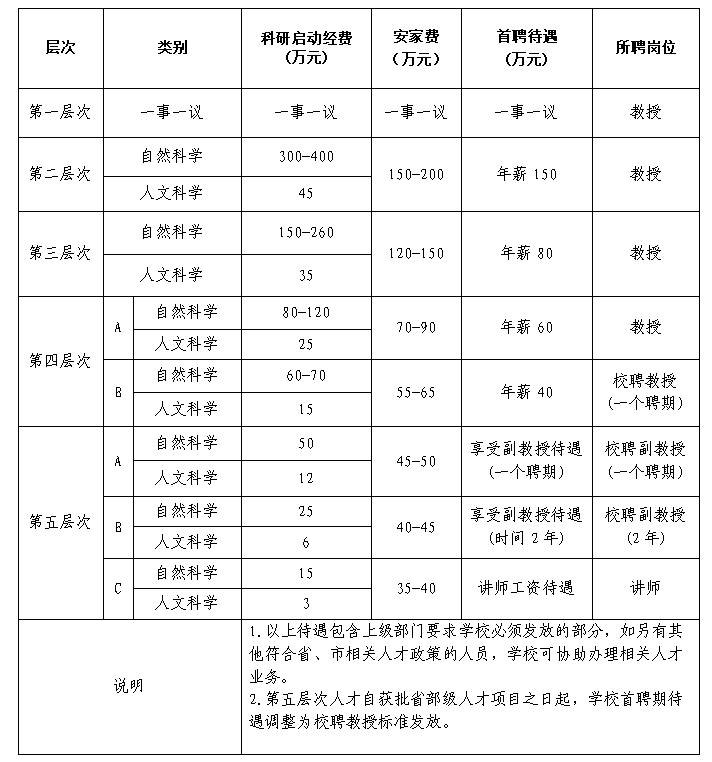 (一)全職引進人才,根據(jù)學校規(guī)定和應(yīng)聘人員學術(shù)水平,劃分人才層次,兌現(xiàn)相關(guān)待遇。