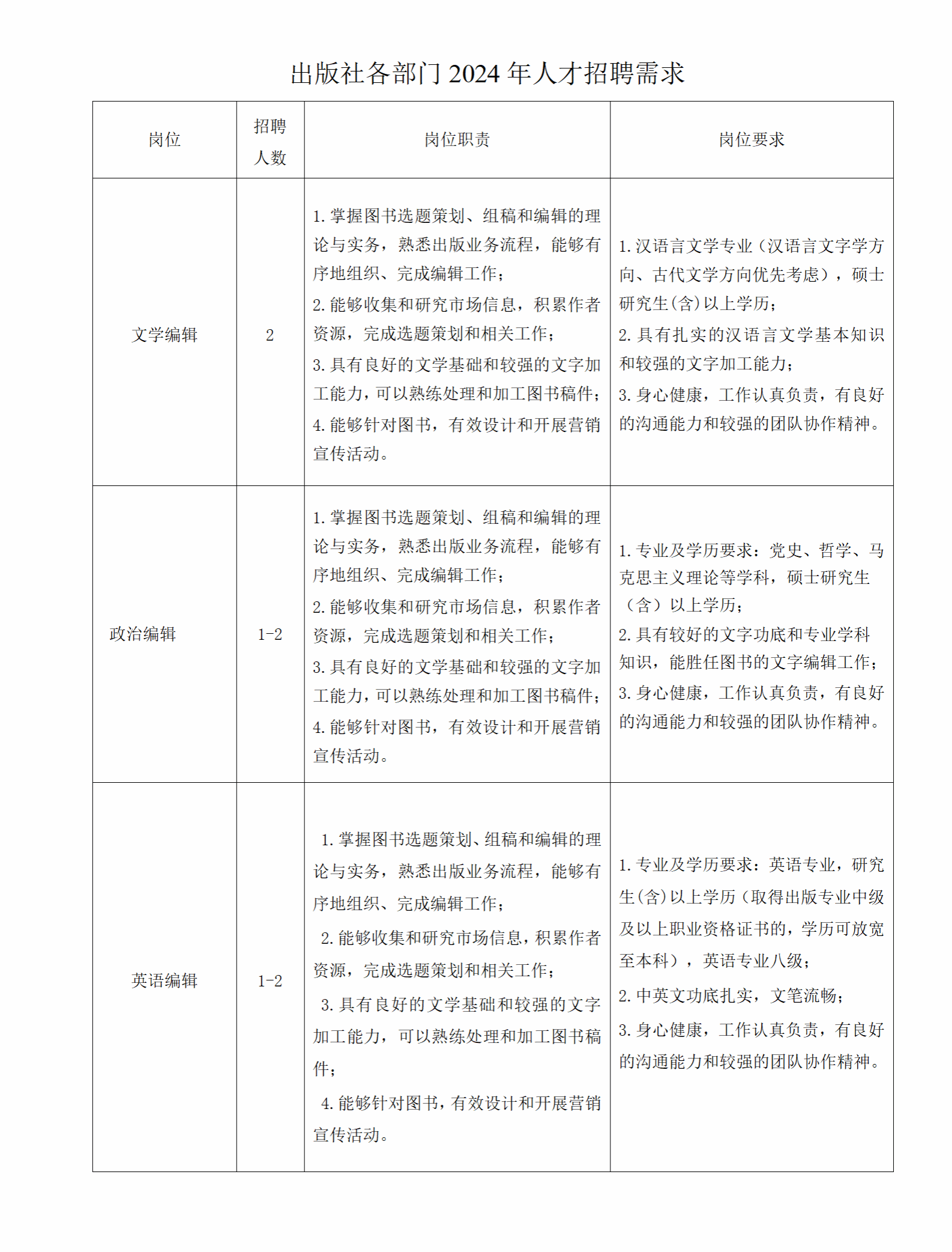 4.有編輯出版相關(guān)工作經(jīng)驗者,可優(yōu)先考慮。取得出版專業(yè)中級及以上職稱人員、取得博士學(xué)位人員、博士后出站人員應(yīng)聘時免筆試。