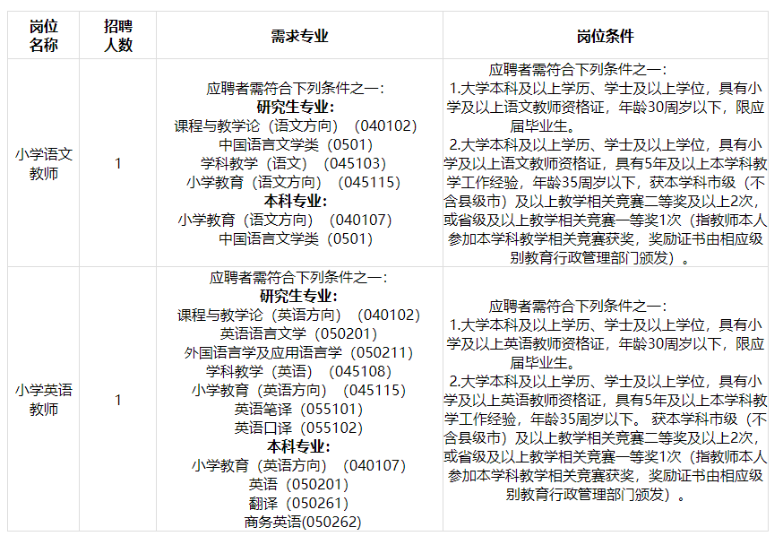需求專業(yè)中“課程與教學論(040102)”專業(yè)考生如報考小學語文崗位需提供語文相關(guān)課程成績單;如報考小學英語崗位則需提供英語相關(guān)課程成績單;“小學教育(040107)”專業(yè)考生如報考小學語文崗位需提供語文相關(guān)課程成績單;如報考小學英語崗位則需提供英語相關(guān)課程成績單;