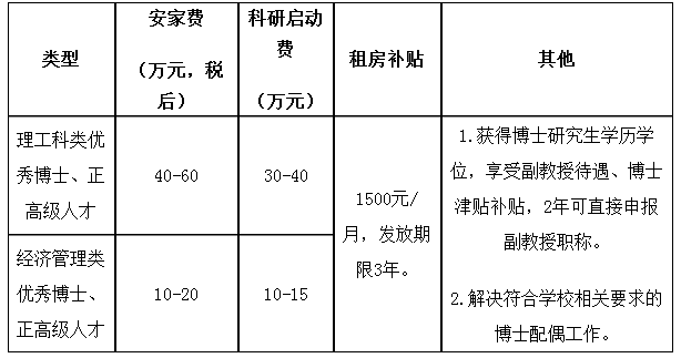 學(xué)校給予全職引進(jìn)高層次人才發(fā)放安家費(fèi)、科研啟動(dòng)經(jīng)費(fèi)、租房補(bǔ)貼等。