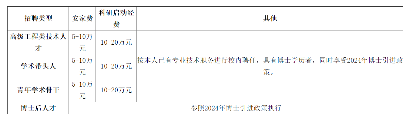 具體引進待遇詳見下表,特別優(yōu)秀或特殊情況者一事一議,一人一策。