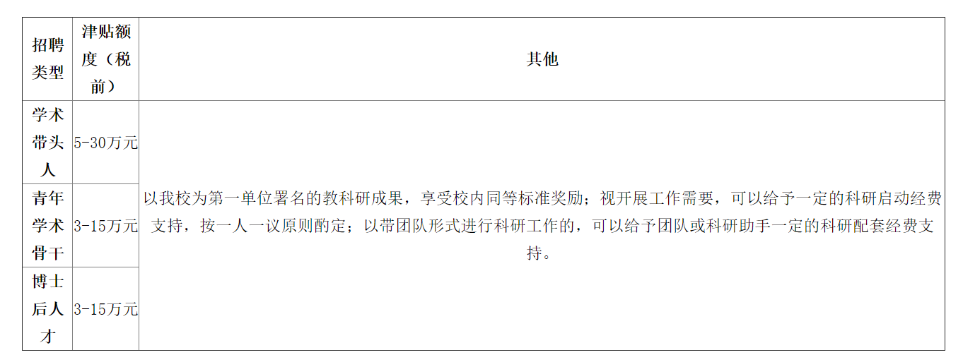 本次招聘人員符合我校高層次人才引進條件的,以人才編解決事業(yè)編制;符合調(diào)動條件的,以調(diào)動方式解決事業(yè)編制。具體引進待遇詳見下表,特別優(yōu)秀或特殊情況者一事一議,一人一策。