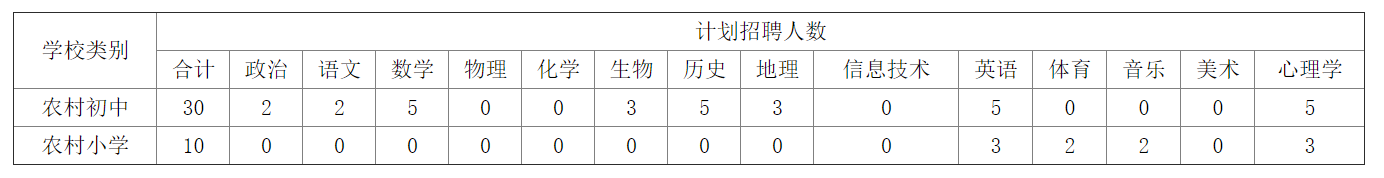 2024年計劃招聘特崗教師40名,其中農(nóng)村初中崗位30名、農(nóng)村小學崗位10名,具體科目計劃招聘人數(shù)詳如下表: