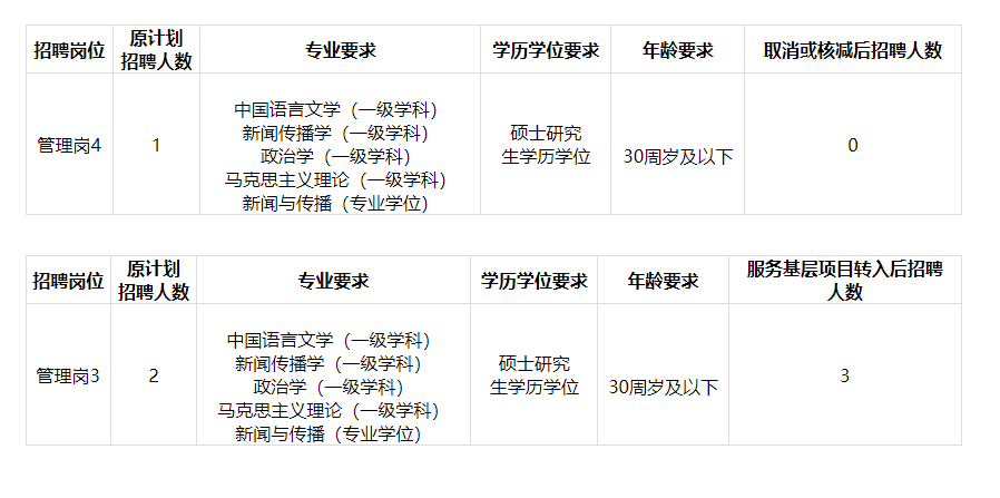 根據(jù)《山西醫(yī)科大學汾陽學院2024年公開招聘工作人員工作方案》要求,我院公開招聘資格審查工作已結束。根據(jù)公告要求和實際報名情況,按照“崗位資格審查合格人數(shù)與擬招聘人數(shù)原則上應達3:1以上方可開考,報名人數(shù)不達該比例的招聘崗位,按規(guī)定的比例相應核減崗位,如減少到1名仍達不到3:1的崗位,原則上取消招聘崗位”與“服務基層項目人員專門崗位在報名結束后未達規(guī)定比例被取消的,將崗位招聘計劃和報名人員轉入一般性崗位(轉入專業(yè)要求、其他要求等相同的崗位)”的規(guī)定,經(jīng)學院公開招聘領導組研究,決定將管理崗位4(服務基層項目人員專門崗位)取消,其崗位招聘計劃和報名人員轉入一般性崗位管理崗位3。具體如下: