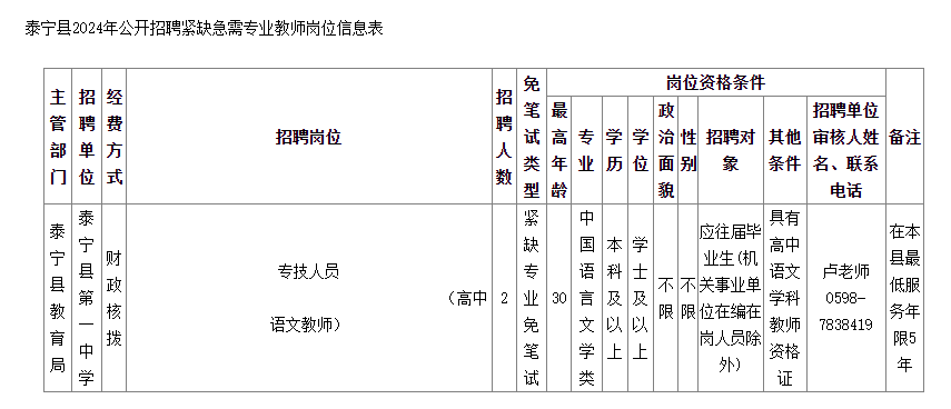 本次共招聘中小學(xué)緊缺急需專業(yè)教師2名,具體招聘崗位、招聘人數(shù)、資格條件等要求,詳見附件《泰寧縣2024年公開招聘緊缺急需專業(yè)教師崗位信息表》。