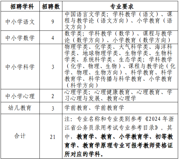 為加強(qiáng)教師隊(duì)伍建設(shè),優(yōu)化柯城區(qū)教師隊(duì)伍結(jié)構(gòu),根據(jù)《浙江省事業(yè)單位公開招聘人員暫行辦法》《衢州市柯城區(qū)事業(yè)單位公開招聘工作規(guī)程》的有關(guān)規(guī)定和我區(qū)教育事業(yè)發(fā)展的需要,經(jīng)研究,決定面向社會公開招聘中小學(xué)、幼兒園事業(yè)編制教師共21名。現(xiàn)將有關(guān)招聘事項(xiàng)公告如下(請仔細(xì)認(rèn)真閱讀以下每一條文):