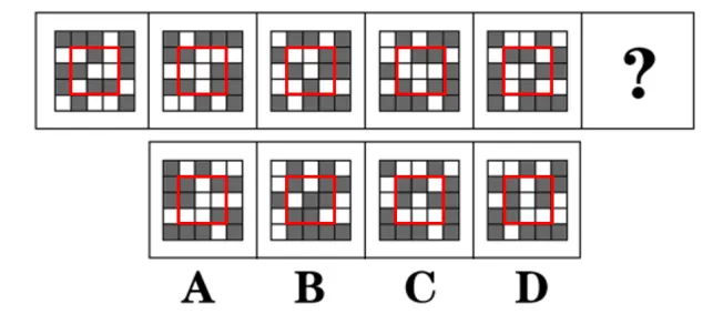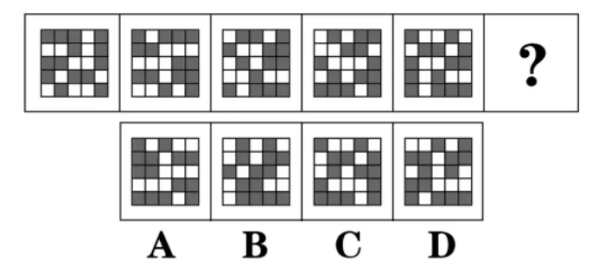 內(nèi)圈的黑塊依次逆時針移動一格,外圈白塊移動明顯,可以考慮觀察白塊,白塊依次順時針移動2格,只有A項(xiàng)符合。